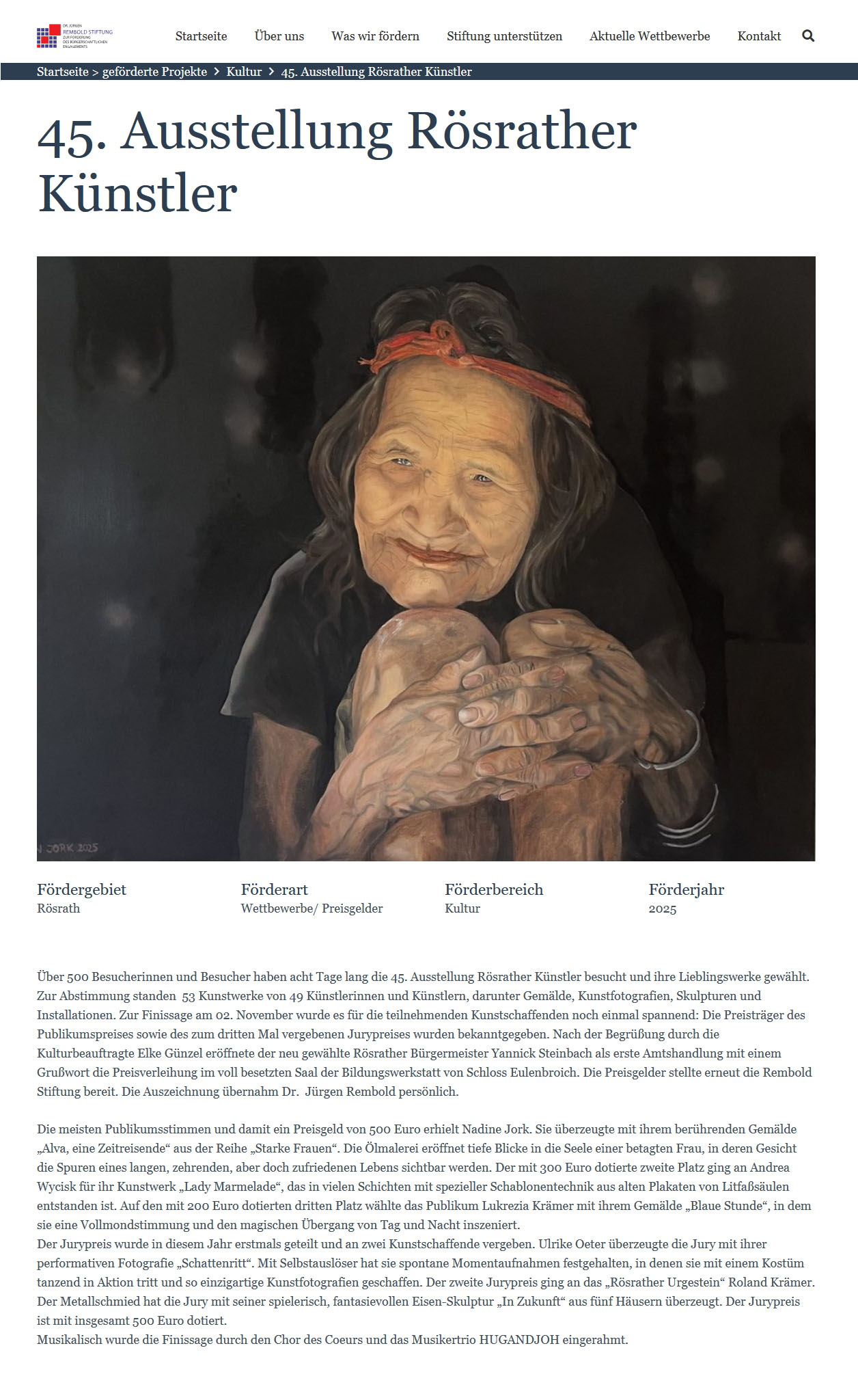 - Die Remboldstiftung berichtet auf seiner Website über die 44. Ausstellung der "Rösrather Künstler", bei der Nadine Jork den zweiten Platz erhält